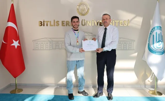 Bitlis Eren Üniversitesi Rektörü Prof. Dr. Necmettin Elmastaş, Üniversiteler Ligi Kick Boks Türkiye Şampiyonası’nda 67 kilo full contact kategorisinde Türkiye Şampiyonu olan Spor Bilimleri Fakültesi öğrencisi Muhammed Karayılan’ı makamında kabul etti.