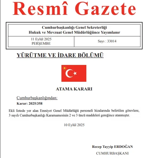 Resmi Gazete’nin 11 Eylül 2025 tarihli ve 2025/358 sayılı Cumhurbaşkanlığı Kararı ile Türkiye genelinde 37 ilin emniyet müdürlüklerinde değişiklik yapıldı.