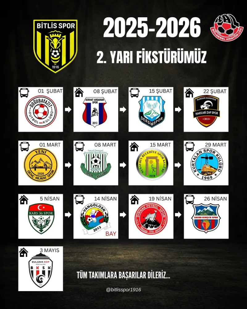 Bölgesel Amatör Lig’de (BAL) mücadele eden Bitlis Spor’un 2025–2026 sezonu ikinci yarı fikstürü açıklandı. Sarı-siyahlı ekip, sezonun ikinci yarısındaki ilk maçına 1 Şubat tarihinde deplasmanda Doğubayazıt Futbol Kulübü karşısında çıkacak.