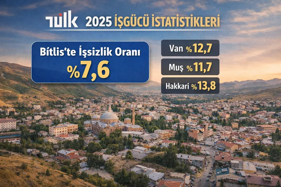 Türkiye İstatistik Kurumu (TÜİK), 2025 yılı işgücü istatistiklerine göre Bitlis’te işsizlik oranı yüzde 7,6’ya gerileyerek Türkiye ortalamasının altına düştü. Ancak işgücüne katılım ve istihdam oranlarında düşüş dikkat çekti.