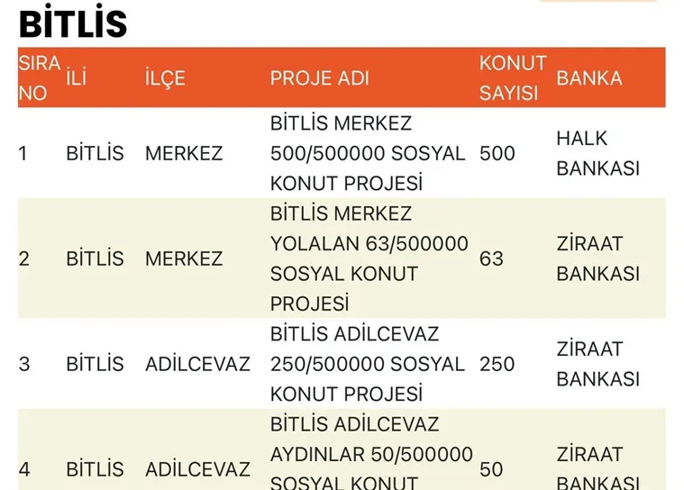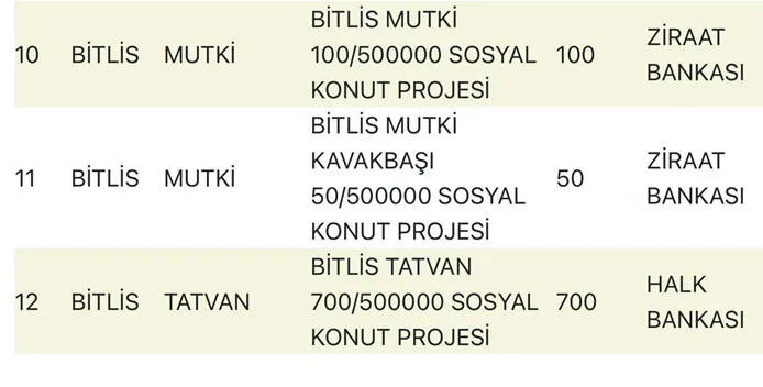 Cumhurbaşkanlığı tarafından başlatılan “500 Bin Sosyal Konut Projesi” kapsamında Bitlis genelinde toplam 2 bin 363 konut inşa edilecek. İl genelindeki konutların dağılımı şu şekilde belirlendi: Merkez 500, Tatvan 700, Güroymak 300, Adilcevaz 250, Ahlat 150, Hizan 100, Mutki 100, Aydınlar 50, Gölbaşı 50, Günkırı 50, Kavakbaşı 50 ve Yolalan 63 konut.