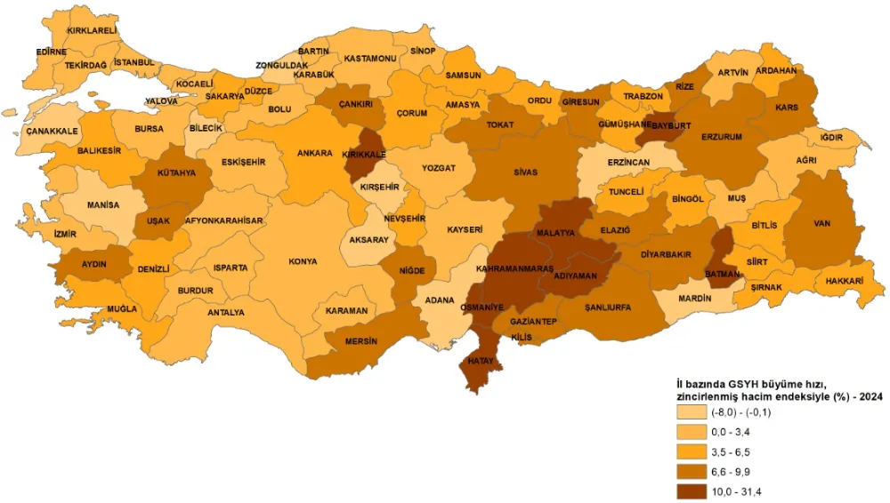 Yıllık GSYH, zincirlenmiş hacim endeksiyle 2024 yılında bir önceki yıla göre %3,3 artarken, 46 ilde Türkiye ortalamasının üzerinde artış gerçekleşti. Bir önceki yıla göre 2024 yılında en yüksek artış gösteren ilk üç il sırasıyla %31,4 değişim oranı ile Adıyaman, %17,1 ile Bayburt ve %17,0 ile Malatya oldu. Bir önceki yıla göre en yüksek azalış gösteren üç il ise sırasıyla %2,4 ile Bilecik, %5,7 ile Kırşehir ve %7,9 değişim oranı ile Erzincan oldu.