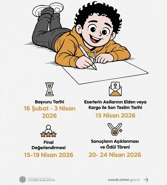 Çocukların hayal dünyalarını sanatla buluşturmayı amaçlayan yarışmada öğrenciler, CİMER’i kendi bakış açılarıyla resmederek 23 Nisan coşkusunu tuvale yansıtacak. Yarışmaya başvurular 16 Şubat – 3 Nisan 2026 tarihleri arasında yapılabilecek.