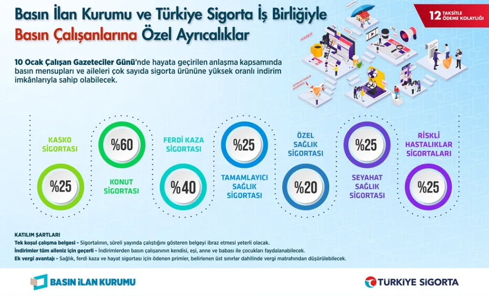 İş birliği kapsamında Basın İlan Kurumu’na akredite gazete, dergi ve internet haber sitelerinde istihdam edilenler ve birinci derece yakınları, Türkiye Sigorta A.Ş. tarafından sunulan sigorta ürünlerinden indirimli olarak yararlanabilecek. Basına yönelik destekler; kasko, konut, ferdi kaza, sağlık ve seyahat sigortaları başta olmak üzere geniş bir yelpazeyi kapsıyor.