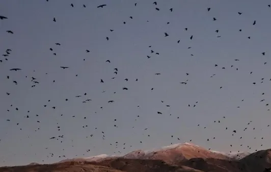 Tatvan’da akşam saatlerinde doğanın büyüleyici bir sahnesine ev sahipliği yaptı. Gün batımına yakın dakikalarda bir anda gökyüzünü kaplayan yüzlerce karga, Van Gölü üzerinde görsel bir şölen oluşturdu.
